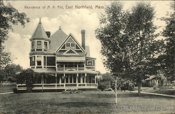 Front: Residence of A. P. Fitt, East Northfield, Mass. 1155 Back: 997 The Bookstore, East Northfield, Mass. Domestic 1 c. Foreign 2 c. محمد