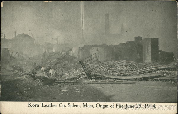 Front: #/ 25 LM Korn Leather Co. Salem, Mass, Origin of Fire June 25, 1914. Back: مة کی (For Correspondence Only) | United States and Island Cuba, Canada and Mexico Here