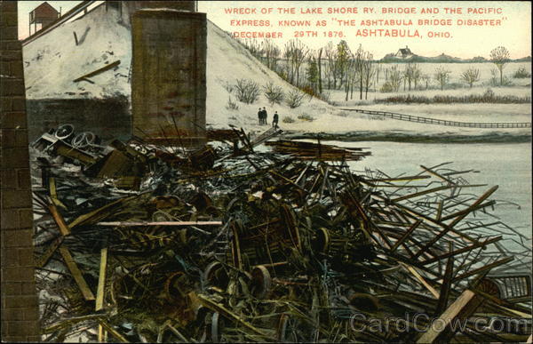 Front: WRECK OF THE LAKE SHORE RY. BRIDGE AND THE PACIFIC EXPRESS, KNOWN AS THE ASHTABULA BRIDGE DISASTER DECEMBER 29 TH 1876. ASHTABULA, OHIO. Back: Jonnd. Lee, Publisher, Ashrapa harbor, Unio. For Correspondence. TWO CENTS