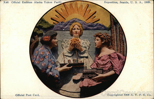 Front: X46 Official Emblem Alaska Yukon Pacific Official Post Card, Exposition, Seattle, U. S. A., 1909. 37 Copyrighted 1908 A. Y. P. E. Co. Back: Portland Post Card Co., Seattle, Wash., and Portland, Ore. AND CANADA, FOREIGN, Two CENTS.