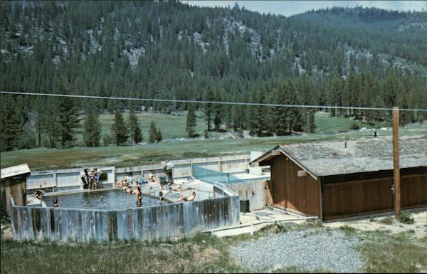 | The water for this pool is channeled from natural hot mineral springs in the Grover Hot Springs State Park. Pool temperature is approximately 105 degrees. The dressing rooms and wind screens are constructed of century old lumber brought down from Silver Mountain City |