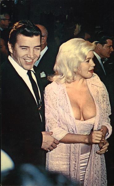 Jayne Mansfield and husband Mickey Hargitay arrive at the glamourous Hollywood Premiere. DISTRIBUTED BY MITOCK & SONS, 13561 VENTURA BLVD. SHERMAN OAKS, CALIF by COLOURPICTURE PUBLISHERS, INC., Boston 30, Mass USA. P59034 Color by Don Andrews HERE