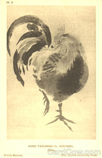 Front: IX. 5 KANO YASUNOBU (c. 1620-1685). Cock. British Museum. Phot. Oxford University Pres3. Back: P O S T IN ENGLAND OR WRITTEN MATTER