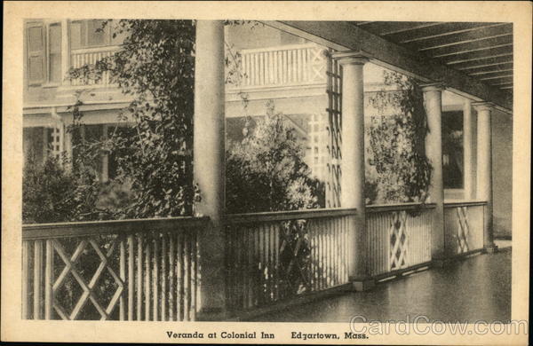 Front: Veranda at Colonial Inn #ff Edgartown, Mass. Back: PUBLISHED BY EDGARTOWN DRUG CO., EDGARTOWN, MASS. THE FINEST AMERICAN MADE VIEW POST CARDS-THE ALBERTYPE CO., BROOKLYN, N. POST CARD
