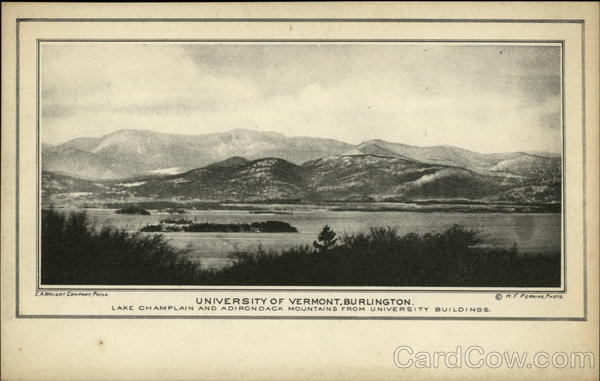 E.AWRIGHT COMPANY, PHILA. MA UNIVERSITY OF VERMONT, BURLINGTON. LAKE CHAMPLAIN AND ADIRONDACK MOUNTAINS FROM UNIVERSITY BUILDINGS. H.F. PERKINS, PHOTO.