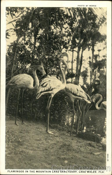 Front: PHOTO BY MORSE FLAMINGOS IN THE MOUNTAIN LAKE SANCTUARY, LAKE WALES, FLA. 886-29 Back: PUBLISHED BY MORSE'S PHOTO SERVICE, LAKE WALES, FLA. C. T. AMERICAN ART DUOTONE (19) GOO HERE