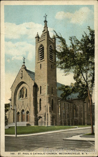 Front: 101 149. ST. PAUL'S CATHOLIC CHURCH, MECHANICVILLE, N. Y. Back: PUBLISHED BY M. B. CALDWELL, MECHANICVILLE, N. Y. MADE IN USA A-96502 TE. AND ISLAND POSSESSIONS, CUBA, CANADA AND MEXICO FOR FOREIGN