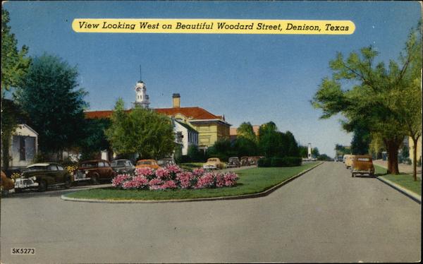 Front: SK5273 View Looking West on Beautiful Woodard Street, Denison, Texas Back: Published by Chief News Agency, Denison, Texas A ShiniColor" by "Colourpicture", by"Colourpicture", Boston 15, Mass, U.S.A. Photo by Tutwiler Studio HERE