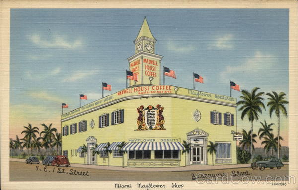 As American as the Swanee River! The Home of Mayflower Doughnuts A modern reasonably priced Drive-in Restaurant in the heart of Miami. Everything for your comfort and convenience - free parking for guests - curb service, a luxuriously restful dining room - a Magic Service Soda Fountain and at last, a convenient, beautiful place to meet your friends. Meet Me at the Mayflower