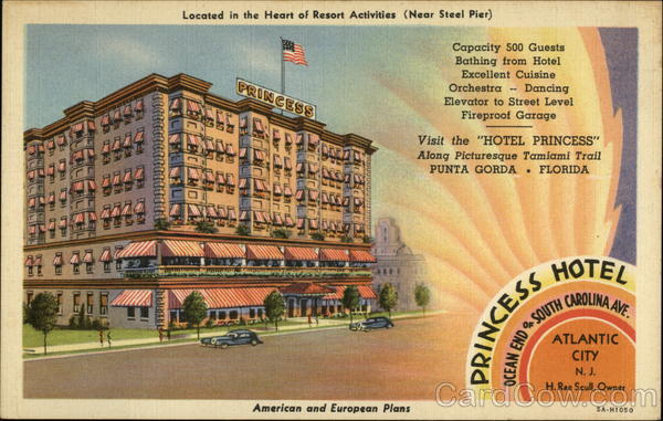 Located in the heart of resort activities (near Steel Pier); American and European plans; capacity 500 guests; bathing from hotel; excellent cuisine; orchestra - dancing; elevator to street level; fireproof garage; visit the "Hotel Princess" along picturesque Tamiami Trail, Punta Gorda, Florida |