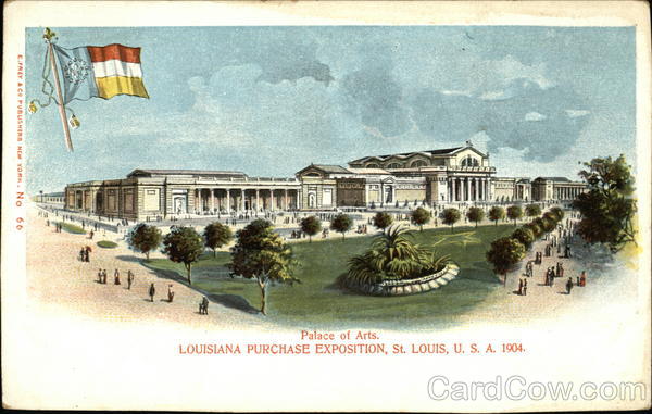 Front: E.FREY & CO PUBLISHERS NEW YORK. No 66 #f jik pj ANGAL JOCUDDU CERARARAR niv }} Palace of Arts. LOUISIANA PURCHASE EXPOSITION, St. LOUIS, U. S. A. 1904. Back: 2427 DOMESTIC. FOREIGN. TWO CENTS.