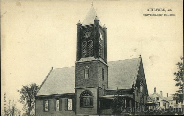 Front: Packard & Ross, (Œ GUILFORD, ME. UNIVERSALIST CHURCH. Back: Raphael Tuck & Sons Post Card Series No. 2229. GUILFORD, Me." ART PUBLISHERS TO THEIR MAJESTIES THE KING AND QUEEN, ARTISTIC MARK