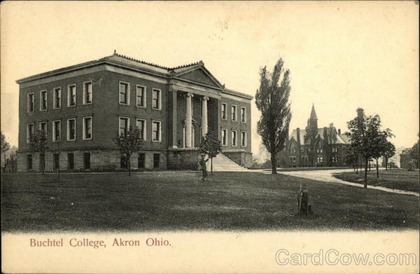 Front: 00000 05 7.70 Buchtel College, Akron Ohio. 100 Back: Publisher Emile Chmelitzki, Canton Ohio U. S. A. in Germany 1 Cent for Domestic. 2 Cents for Foreign. Place the Stamp inside the square.