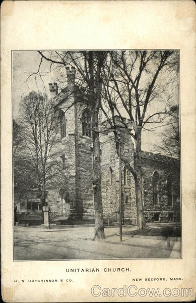 Front: UNITARIAN CHURCH. H. S. HUTCHINSON & CO. NEW BEDFORD, MASS. Back: SOUVENIR OF NEW BEDFORD, MASS., U. S. A. Once the famous WHALING PORT now the FIRST city in America in the manufacture of Fine Cotton Goods. HERE