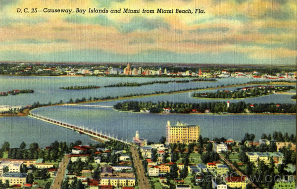 Front: D. C. 25-Causeway, Bay Islands and Miami from Miami Beach, Fla. 9A-HI14 Back: DADE COUNTY NEWSDEALERS SUPPLY CO., MIAMI, FLA.