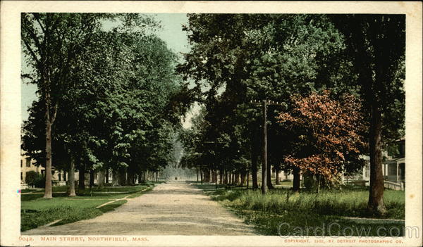 Front: 6042. MAIN STREET, NORTHFIELD, MASS. WA COPYRIGHT, 1902, BY DETROIT PHOTOGRAPHIC CO. Back: POST CAR ST MA mam 1938 Mrs. C.A. Miles. 16 Chapin St. Bratth how VC. SERIES 1902 UNITED STATES OF 1706 FRANKLIN 1790 ONE CENT