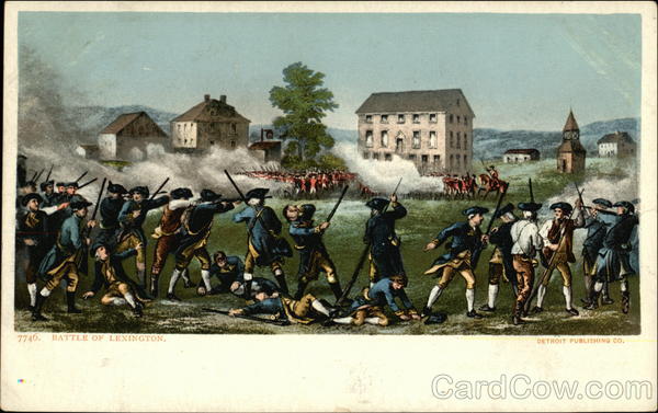 Front: 7746. BATTLE OF LEXINGTON. !!! DETROIT PUBLISHING CO. Back: HIS SIDE FOR THE ADDRESS. 200 AND CANADA, FOREIGN, Two CENTS.