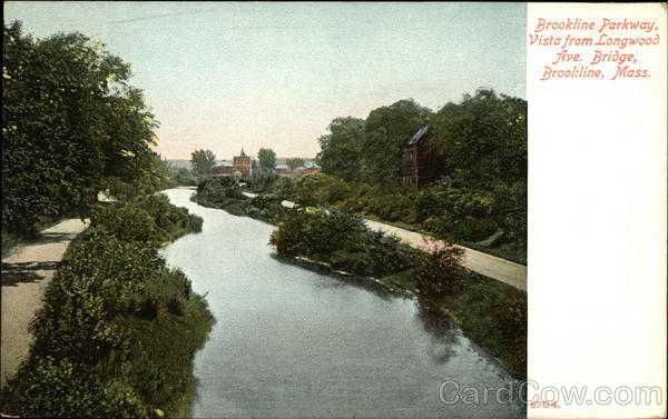 Front: Brookline Parkway, Vista from Longwood Ave. Bridge, Brookline, Mass. 6704. Back: The Metropolitan News Co., Boston, Mass. Manufacturers of Souvenir Postal Cards. Post Card * Made in Germany.
