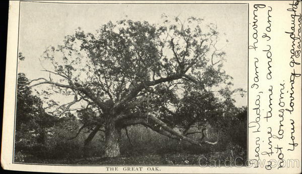 Front: THE GREAT OAK. Dear Dada, Iam having fine time and I am not lonesome. Your loving grandaught Back: UTH JUL 1910 hay' St., mr. S. H. 330 Central Auburndale, Mass. Care of Mr. W. T. Farley. ONE CENT