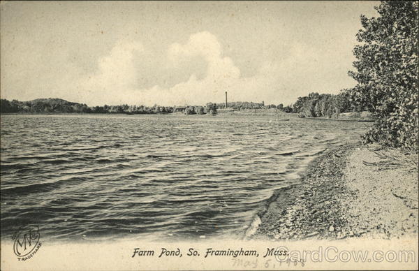 Front: COM CNS RADEMARK Farm Pond, So. Framingham, Mass. May 5, 1908 Back: The Metropolitan News Co., Boston, Mass. and Germany. 1308. RIGHTED Wes MALN3 Post Card & TWO CENTS