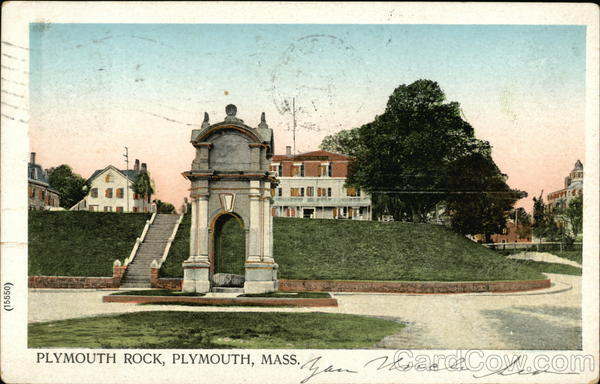 Front: (15550) PLYMOUTH ROCK, PLYMOUTH, MASS. au Uncle sen Back: 38 ㅂ 9061 Wd 9 A PROV BRO WINGLE UTH ABR 24 2-30P MASS Master Bennie lachen EN PLI 06 NITED STATES OF 1706 FRANKLIN 1790 26. Columbia Brushlon 32 Mm.