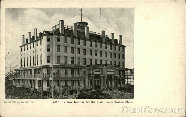 Front: IIIIIII DDDDDDD 105 SOUVENIR POST CARD CO., NEW YORK. 11 ונטינחוננה 6987-Perkins' Institute for the Blind, South Boston, Mass. Back: Post Card- -|- TWO CENTS