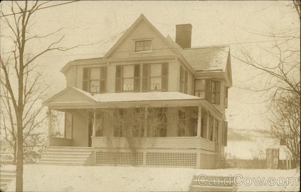 White house with porch, with snowy ground