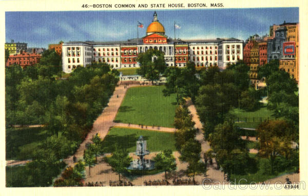 Boston Common, made famous during the Revolutionary War, still retains the same area it had in that historic time. Along the Tremont Street side are located a number of subway entrances and exits and the street is lined with curious and old buildings of a uniform design built many years ago. |