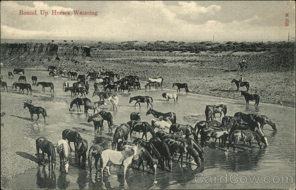 Front: Round Up Horses Watering तिनक M 808 Back: Photo copyright Chas. E Morris, Chinook, Montana Message may be written on this Side Ona Cent for United States, and Island Possessions, Cuba, Canada and Made in Germany