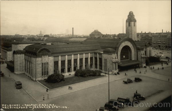 Front: HELSINGFORS -JARNVAGS STATION. Back: Postikortti Postkort SUOMI FINLAND Raymond Elman 17 Spill 1989