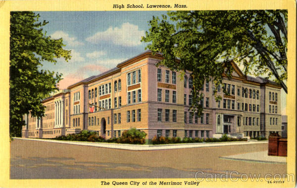 Front: High School, Lawrence, Mass. The Queen City of the Merrimac Valley SA H2259 Back: LOUIS PEARL, LAWRENCE, MASS.