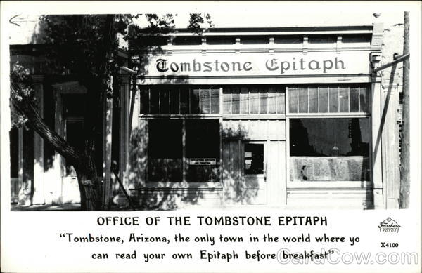 Front: Tombstone Epitaph TOMBSTONE EPITAPH JOB PRINTING OFFICE OF THE TOMBSTONE EPITAPH "Tombstone, Arizona, the only town in the world where can read your own Epitaph before breakfast" yo Frashers INCORPORATED X4100 Back: JOCON, ARIZONÄ€ DK 1