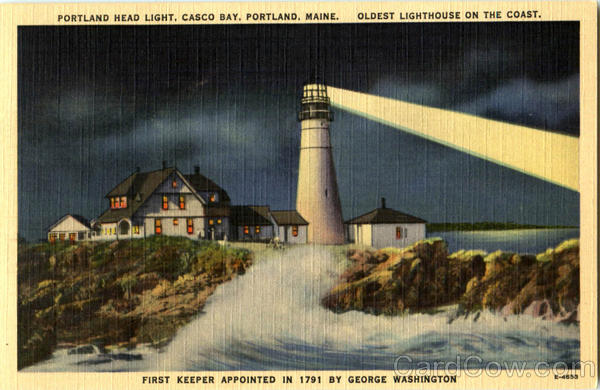 Front: PORTLAND HEAD LIGHT, CASCO BAY, PORTLAND, MAINE. OLDEST LIGHTHOUSE ON THE COAST. E-4653 FIRST KEEPER APPOINTED IN 1791 BY GEORGE WASHINGTON Back: Made by Eastern Photo Litho Co., Lowell, Mass.