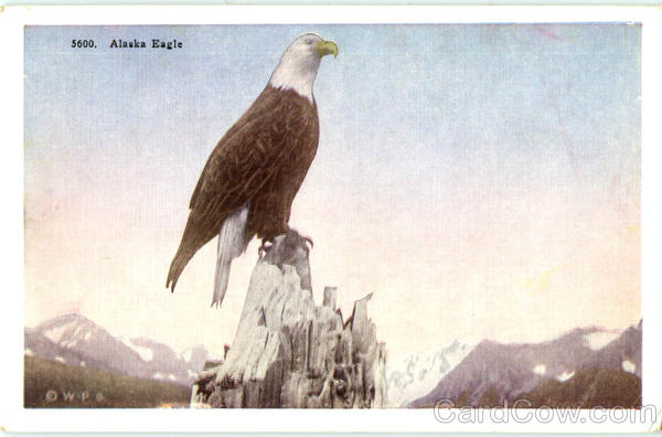 | From the tree-tops and rocky promontories of the seacoast to the aeries high among the mountain tops the American Eagle, symbol of freedom, is one of the features of interest to those who travel in Alaska. The natives of southeast Alaska have given the eagle a prominent place in their crude designs of family crests and totem carvings. |