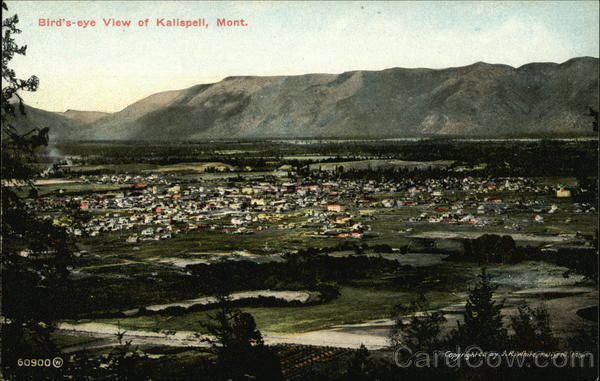 Front: Bird's-eye View of Kalispell, Mont. 60900 W Copyrighted by J.R. White, Kalispell, Mont. Back: Published by James R. White, Kalispell, Mont. વસ૬) STAMP HERE