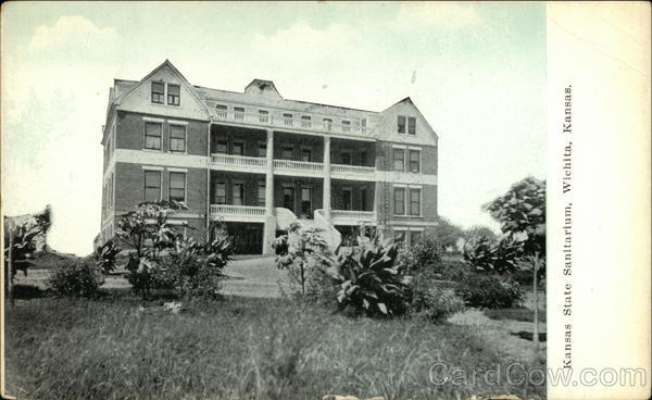 Front: Kansas State Sanitarium, Wichita, Kansas. Back: Published by Kansas City Post Card Co. This space can be used for a written message. TWO CENTS.