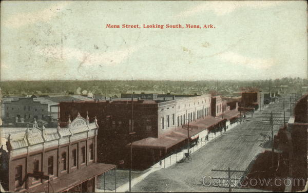 Front: He AN FESTIVE Mena Street, Looking South, Mena, Ark. |||||| Ba **** Back: тела Аг Pub. by Davis Drug Co. coupers and juin bunch of ourtis here- get Dearest; JUL 7 3 PM ARK JUL Is Louise Arnold, Waverly Rs.