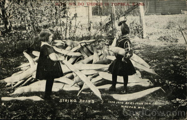 Front: WE DO THINGS IN TOPEKAR NS. STRING BEANS COPR. 1910 BY AS JOHN SON JA WAUPUN WIS, Back: Johnson, Photographer, Waupun, Wit YARD Post Cape HERE
