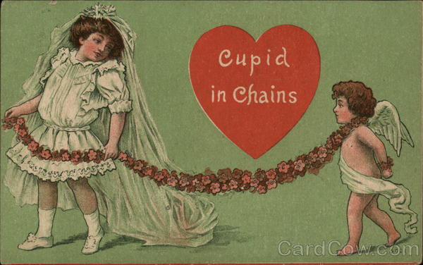 Front: 300 Well casas 2 80 Cupid in Chains 5001 Back: VERS FEB PM 1910 FOR ADOLESS ONL THIS SPACE MAY BE USED FOR CORRESPONDENCE. DANV Post Ca ONE CRIT Feb. 141-19 10 Compluments Miss Ceda Kanfaren Marvel sik anvers R.R. No. 3, Ill