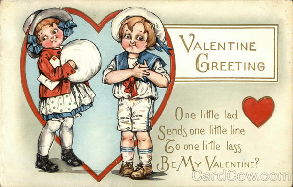 Front: th VALENTINE GREE OREETING One little lad Sends one little line Go one little lass BE MY VALENTINE? Back: From your School Mate Stella Mehl Ada Kaufman. Danvers Illinois