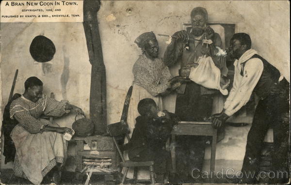Front: A BRAN NEW COON IN TOWN. COPYRIGHTED, 1898, AND PUBLISHED BY KNAFFL & BRO., KNOXVILLE, TENN. DA Wn Back: ADEL POSTCARDOAD 7-30P PA. 19 STREET R.F.D. No. 2 STATION Place the }* mus. I her. H. Coleman по Romulion new york