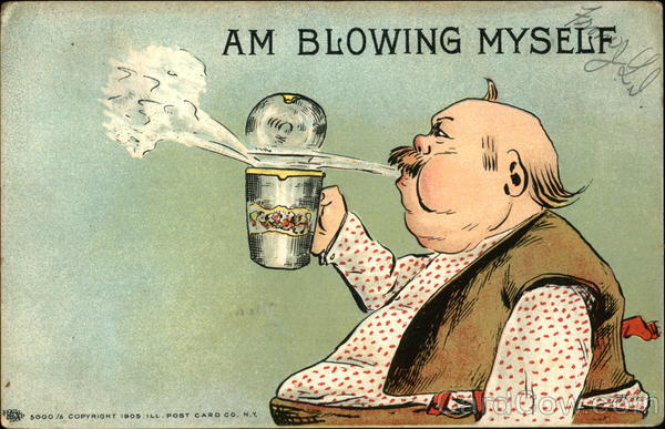 Front: 27 AM BLOWING MYSELF al 5000/5 COPYRIGHT 1905. ILL. POST CARD CO. N.Y. 111 Back: ORK POST CARS 2 1030rmvi ISTRE Mrs John Ives Bei Street. god of 1. Minister w NERIES 1902Y UNITED STATES OF RICA US 1906 1706 FRANKLIN 1790 Come
