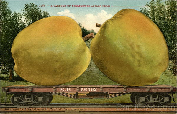 Front: 2186 -A CARLOAD OF BELLFLOWER APPLES FROM S.P. 56492 E P 32 Copyright 1910 by Edward H. Mitchell San Francisco CAR 60000 11724/08 04 EWT.22000 Back: MADE IN AMERICA BY EDW.H.MITCHELL AT SAN FRANCISCO.CALIFORNIA. ONLY