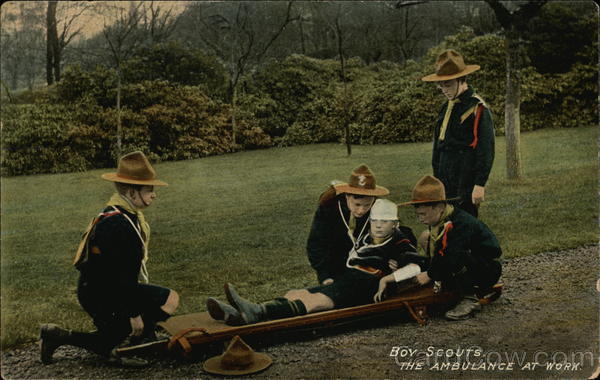 Front: BOY SCOUTS. THE AMBULANCE AT WORK. Back: COLONIAL, AND CERTAIN FOREIGN CORRESPONDENCE NATIONAL" SERIES. Made in Gt. Britain. No. 345. CARD. BE WRITTEN HERE. Here.