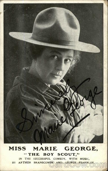 Front: Sund Marcel ye MISS MARIE GEORGE, "THE BOY SCOUT,” IN THE SUCCESSFUL COMEDY, WITH MUSIC, BY ARTHUR BRANSCOMBE AND GEORGE FEARNLEY. Back: BIRMING H A M . HUDSON, TYP. MESSAGE. cair 2D. STAMP ТО ВЕ AFFIXED сати "The Boy Scout Макините