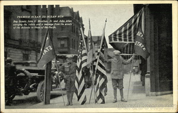 Front: PREMIER OCEAN TO OCEAN RUN Boy Scouts John G. Monihan, Jr. and John Allen carrying the colors and a message from the scouts of the Atlantic to those of the Pacific. ¡AT? Quitandı KEY STATE Back: TWO CENTS