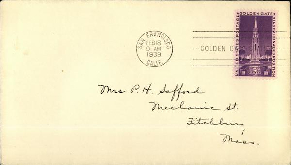 *GOLDEN GATE* FRANCI FEB18 9-AM 1939 CALIF. 39 19 daffend meshanie st. ms PiH. Fitchbur Mass. SAN UNITED STATES POSTAGE* *INTERNATIONALEXPOSİTION