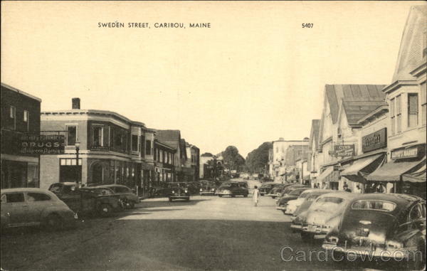 Front: SWEDEN STREET, CARIBOU, MAINE 5407 RRE ALAS RUARMACY ORUGS Wakireen Agency= ERTINY I8SORA CYRS CBEAUTTASER SHOPPE LOYD'S NARKET $8 945 Back: BROOKLINE. MASS PHOTOLUX
