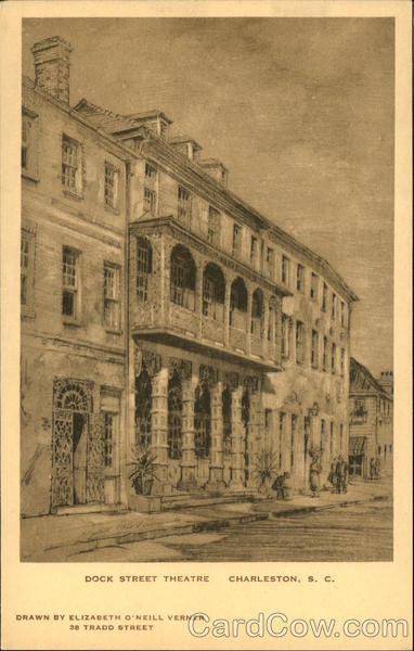 Front: DOCK STREET THEATRE CHARLESTON, S. c. DRAWN BY ELIZABETH O'NEILL VERNER 38 TRADD STREET Back: COPYRIGHT BY ELIZABETH O'NEILL VERNER FOR POSTCARD USE ONLY THE FINEST AMERICAN MADE VIEW POST CARDS-THE ALBERTYPE CO., BROOKLYN, N. Y. IND'S