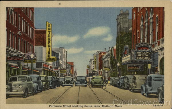 Front: DIYMEMA LOLYMPIA RENaunant THRILLING BELITA SUSPENSE LIQUOR: RE Purchase Street Looking South, New Bedford, Mass. 6B-H1348 ENTERPE Back: DISTRIBUTED BY NEW BEDFORD NEWS COMPANY, NEW BEDFORD, MASSACHUSETTS THEATRE